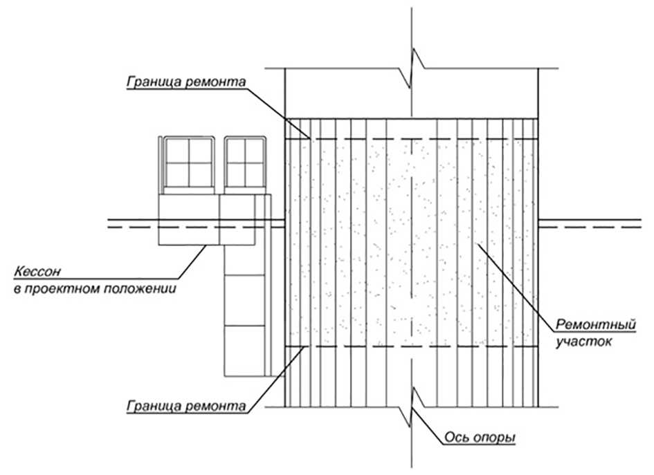 Ремонт и последующая защита поверхностей в зоне переменного уровня воды осуществляется с организацией «сухой рабочей зоны» при помощи кессона. Кессон состоит из кессонной камеры, подкессонного строения и надкессоного строения. Для подачи сжатого воздуха монтируются трубопроводы из двух ниток: рабочей и резервной. Для обеспечения сжатым воздухом монтируется компрессорный узел. Кессоны погружаются под действием собственной массы (см. Рис. 1). Обеспечив точность посадки кессона, наращивают предварительно шахту так, чтобы после погружения она возвышалась над поверхностью воды. Затем на шахте монтируют шлюзовую камеру, подают сжатый воздух в кессонную камеру, осушают ее и приступают к погружению.