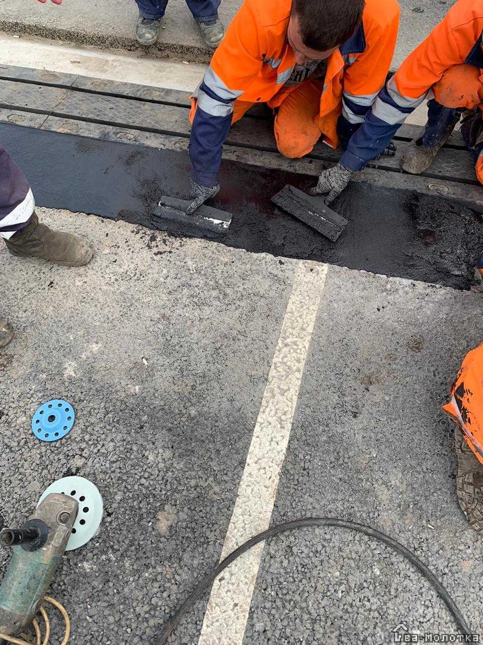 Для ремонта деформационных швов предусмотрена система из быстротвердеющей бетонной смеси АРБ-10 или АРБ-10Ф и полиуретанового герметика Mapeflex PU65. Этот герметик специально разработан для обеспечения автомобильного трафика на дорогах, скоростных автомагистралях и шоссе и способен выдерживать высокие транспортные нагрузки. Mapeflex PU65 устойчив к атмосферным погодным условиям и деформациям вследствие сжатия, обладает хорошей эластичностью, а также прочностью на сдвиг и разрыв.