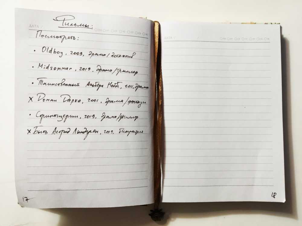 В Bullet journal удобно не только разбираться с планами, но и составлять списки книг, фильмов для будущего просмотра, идей подарков, инсайтов с лекций. Благодаря содержанию список не потеряется, а еще в плане на день можно поставить ссылку на нужную страницу с подборкой фильмов.