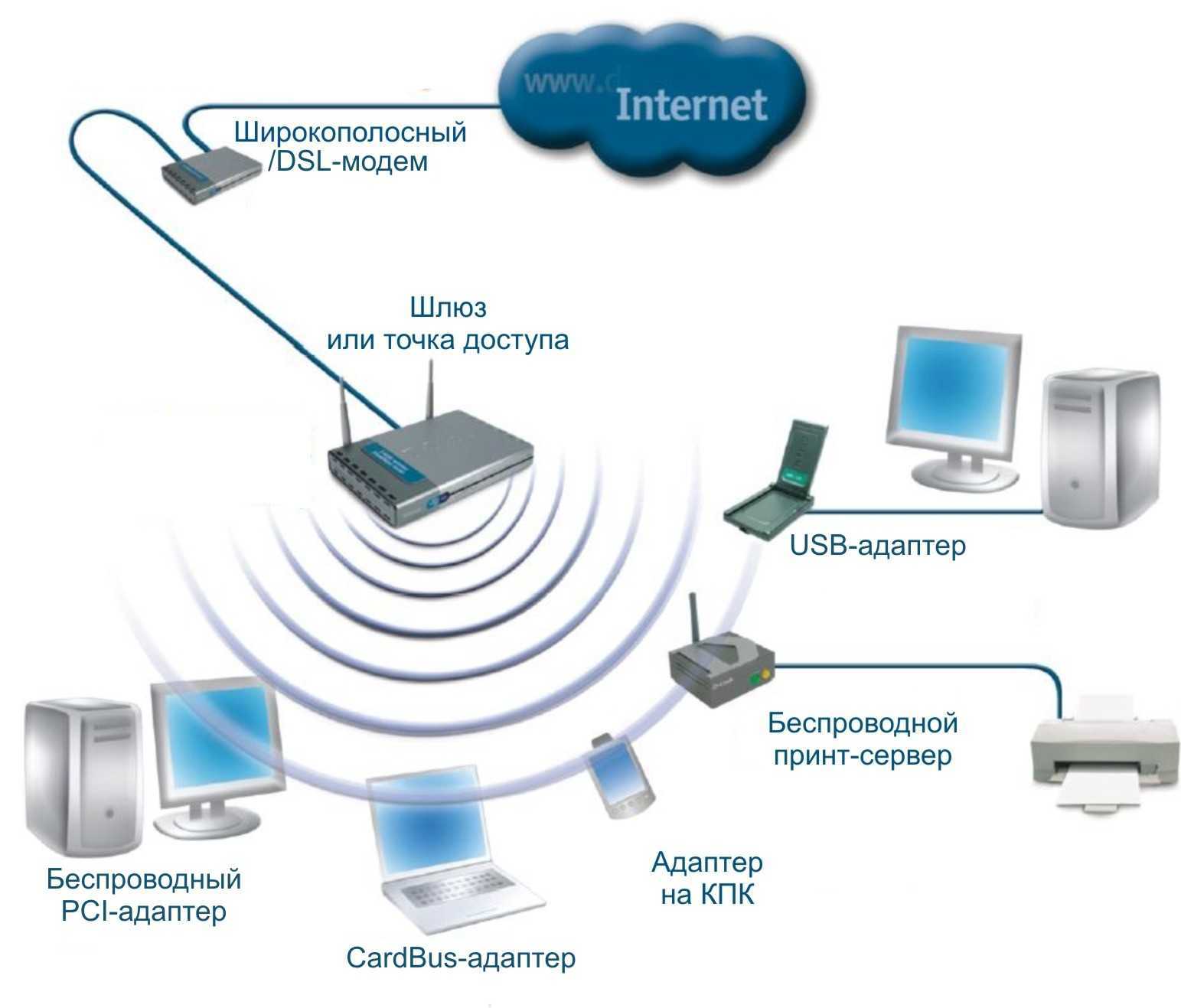 Точка доступа в свою очередь может передавать сигнал из интернета по Wi-Fi адаптерам (USB, для КПК, CardBus и беспроводной PCI) и принт-серверу.