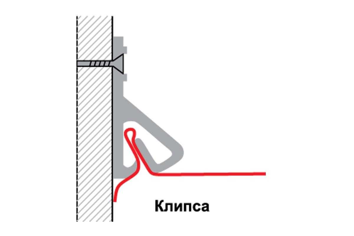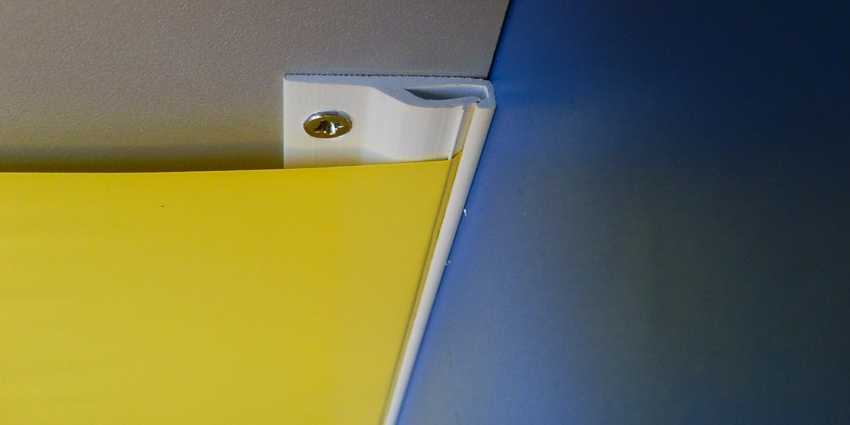 Натяжные конструкции всегда скрадывают высоту. Чтобы минимизировать потери, каркас прикручивают к черновому потолку. При таком способе монтажа «срезание» составит не более 2 см. Профиль фиксируют горизонтально, замок устанавливают под прямым углом от планок. Полотна монтируют клипсовым или гарпунным методом.