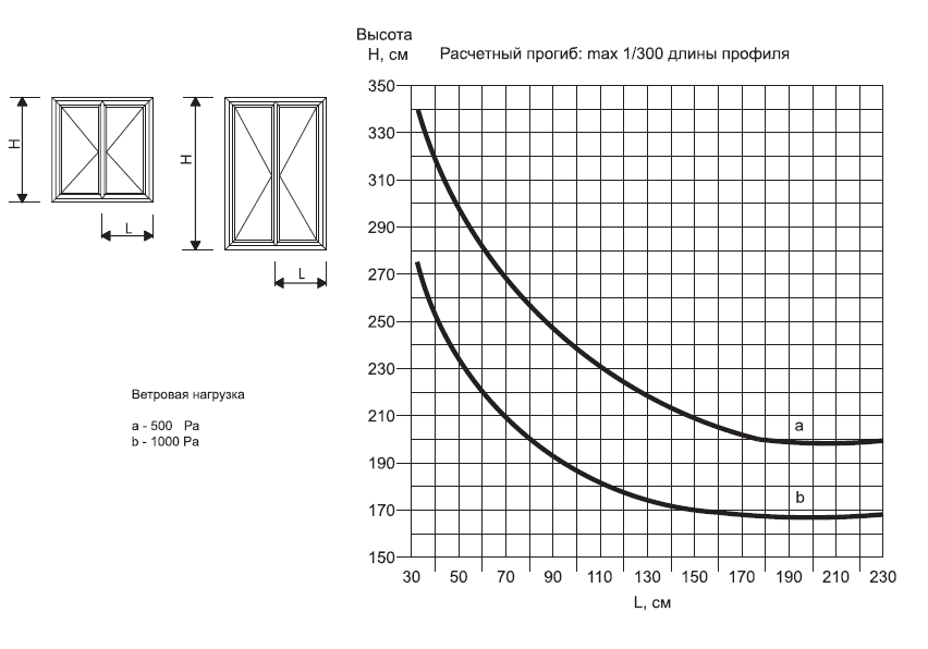 Примечание: при определении максимально возможных габаритов конструкций архитектор или изготовитель конструкций должен принять во внимание не только размеры, моменты инерции профиля и особенности здания (высота над землей), но и метеорологические условия в соответствующем регионе, а также следовать рекомендациям изготовителя фурнитуры. Применяются данные системы в случае, когда не предъявляются требования по теплоизоляции готовых конструкций (используется холодный алюминиевый профиль)
