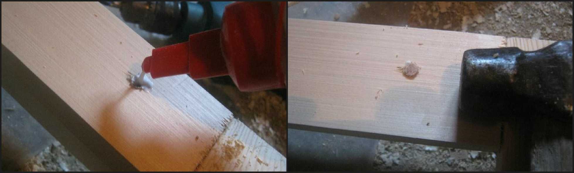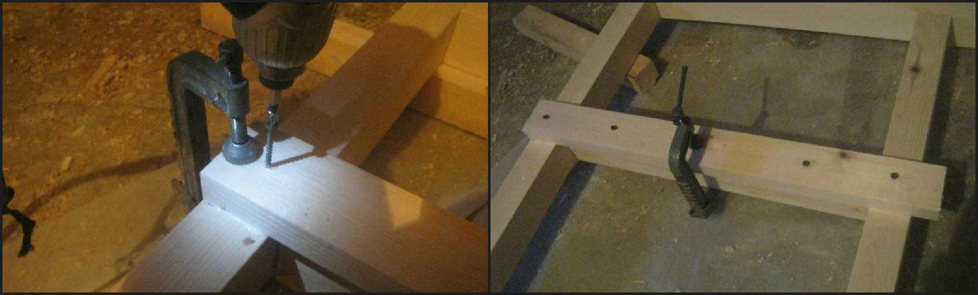 Прижимаем на несколько секунд, чтобы клей схватился и стягиваем склеиваемые поверхности струпциной или тисочками. Затем, чтобы удержать плотность склейки садим элементы на саморезы.