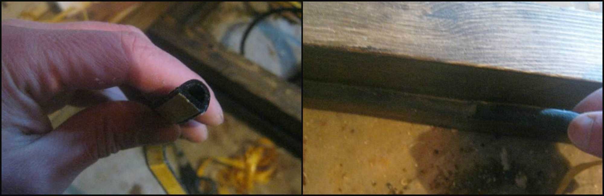Чтобы сказать, что рама полностью готова, и можно переходить к изготовлению створок, нам остается проложить резиновый уплотнитель. Берем так называемый «Д»-образный. Называется он так потому, что в сечении напоминает латинскую «D». Этот уплотнитель уже имеет липкий слой, дополнительно наносить клей не нужно.