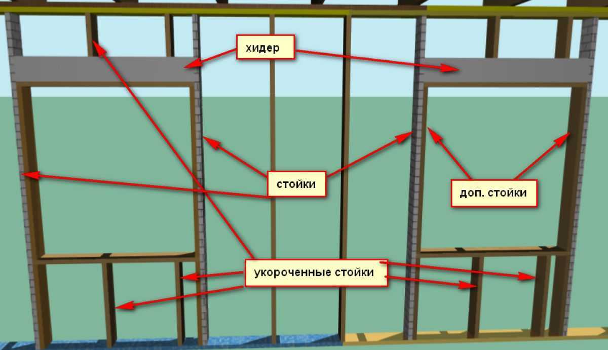 По канадской технологии частного домостроения хидерная конструкция состоит из 2-3 досок, которые устанавливаются на ребро и соединяются между собой гвоздями. На хидер дополнительно устанавливают короткие стойки, которые равномерно распределяют нагрузку, передаваемую несущими балками.