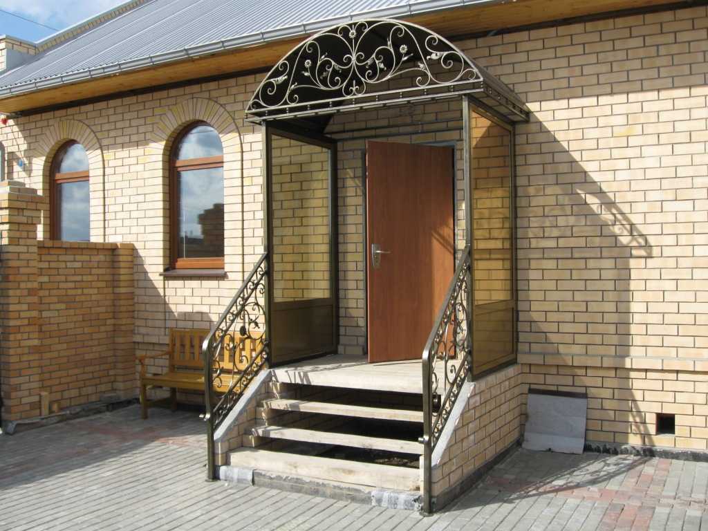 Если дом выполнен из кирпича, то можно устанавливать обычную белую металлопластиковую дверь. Хорошо при этом сочетается цоколь, окрашенный в темно-серый цвет. Козырек можно выполнить из поликарбоната, прикрепив его к стене с помощью кованых креплений.
